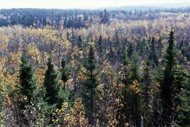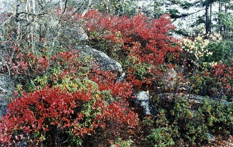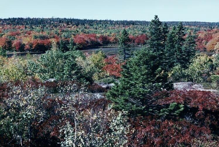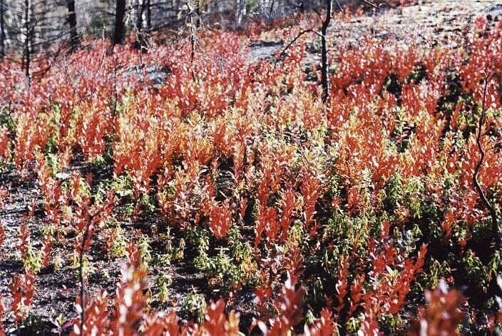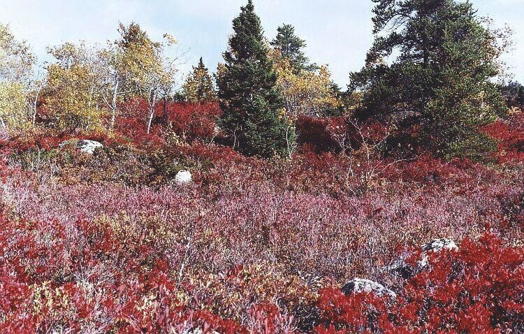 Jack pines atop the plateau The plateau in autumn Red autumn shrubs Strips of granite |