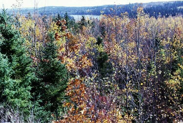 The lake and the Atlantic Ocean viewed from a ridge in the autumn Autumn view of the head of a small bay Trees and shrubs on the east side of the lake in the autumn |