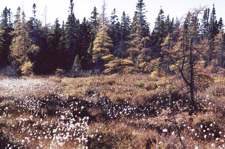 Autumn view of cotton grass and pine trees Autumn view of cotton grass and tamaracks |