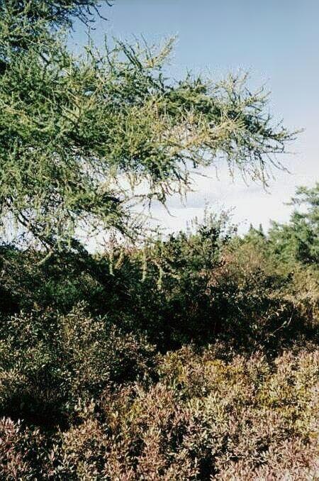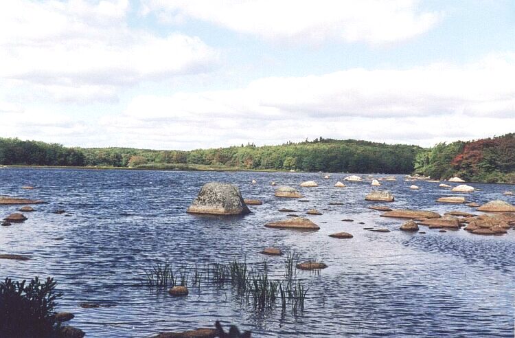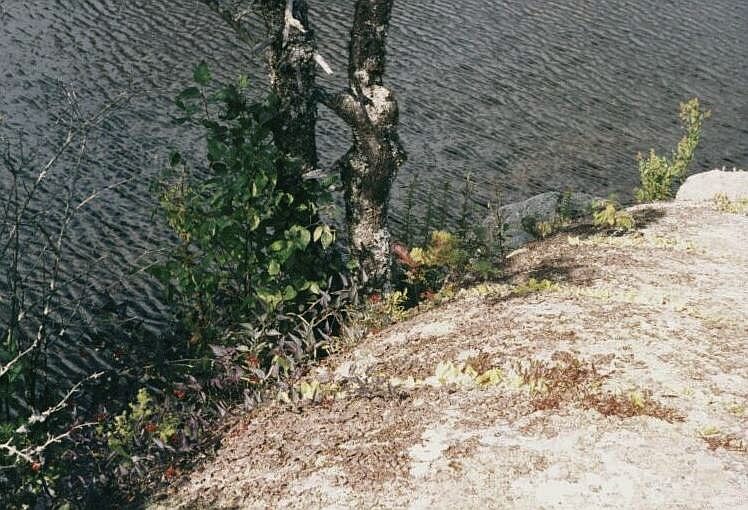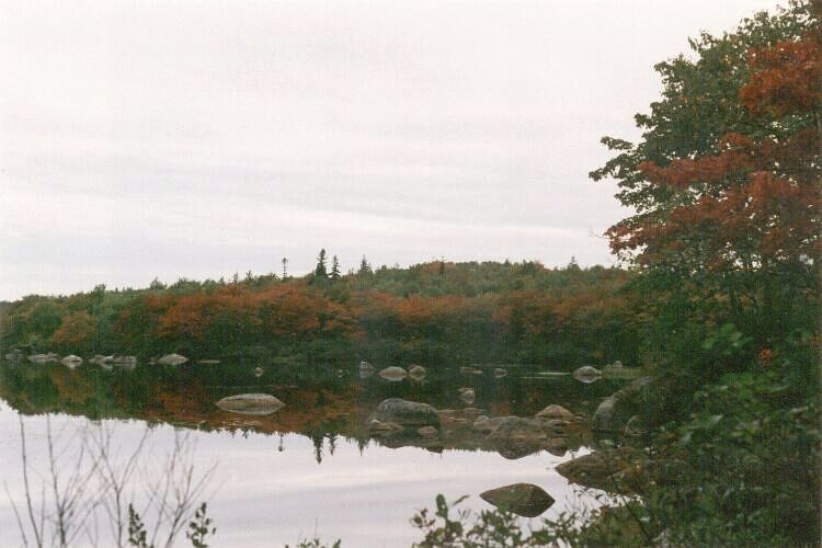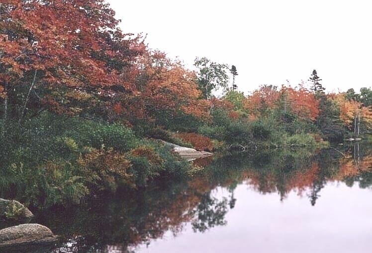 On a brightly sunny morning we walk around the Frog Pond. The coldness of the air, the mist rising from the water, and the presence of autumn colours amidst the predominant green, leave no doubt that it is autumn. Leaving the Frog Pond, we walk in the direction of York Redoubt. It quickly becomes warmer, and it becomes more difficult to remember that it is no longer summer. As we look across from a ridge near York Redoubt to the granite ridge that lies between Colpitt's Lake and Flat Lake, we notice a solitary scarlet maple, but this is not enough to convince us that it is autumn, if we know that the first maples change colour in late summer. In a nearby maple wood, it feels as if it is still summer. |