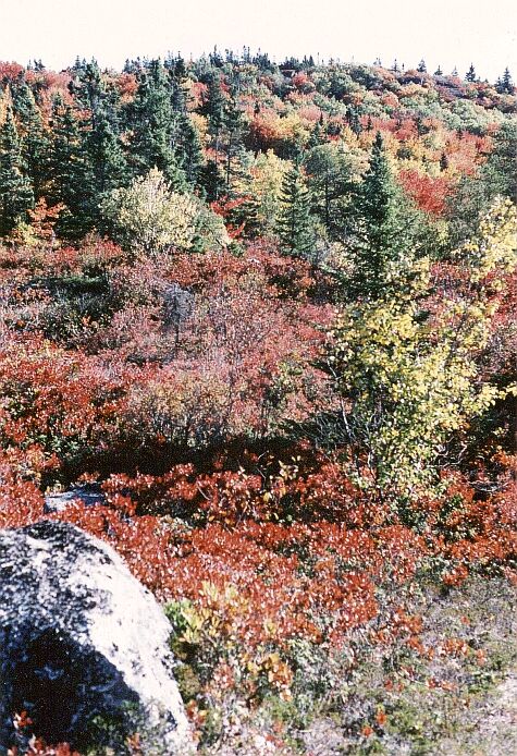 At the southern end of West Pine Island Pond we look across to the western shore, admiring the deciduous trees that grow there. Next we go up on to the ridge between East and West Pine Island Ponds. There we have another view of West Pine Island Pond. We also have an excellent view of East Pine Island Pond and the Atlantic Ocean. The view of the lake and the ocean changes as we proceed along the ridge. The ridge itself is very beautiful. The trees on the ridge are still largely green, and this greatly affects the impression created by those that are not. Descending from the ridge, we reach the northeast corner of West Pine Island Pond, where we can admire at close quarters the superb and varied colours of the deciduous trees lining the shore. |