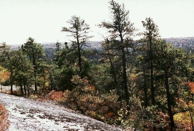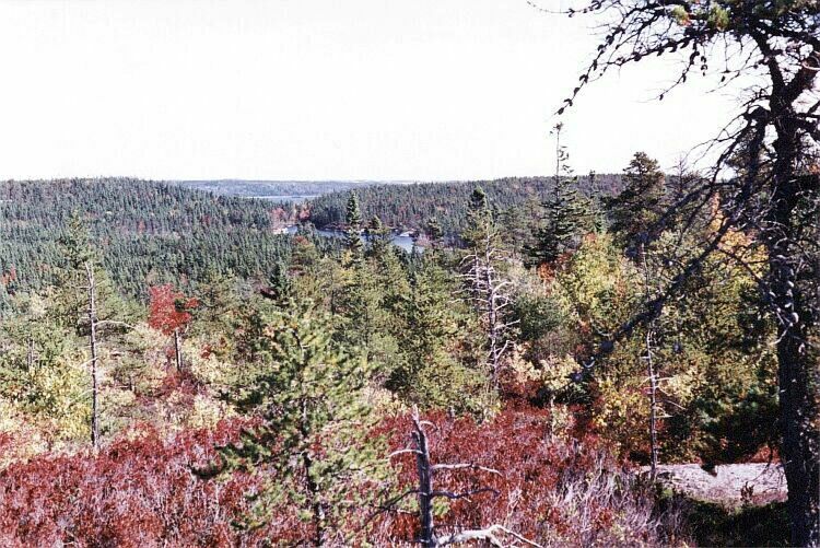 Spryfield - Colpitts Lake - Granite Plateau - Flat Lake | Under blue skies we walk from Spryfield to the north end of Colpitts Lake, where we enjoy the fall colours of the mixed forest. We walk along the western shore of the lake and up on to the granite plateau. On the plateau we walk along strips of granite flanked by jack pines and shrubs. We descend from the plateau and, glancing back through the deciduous woods at the edge of the plateau, we continue on boggy ground until we reach a strip of granite that leads us to the north end of Flat Lake. |