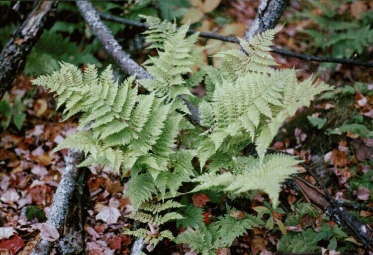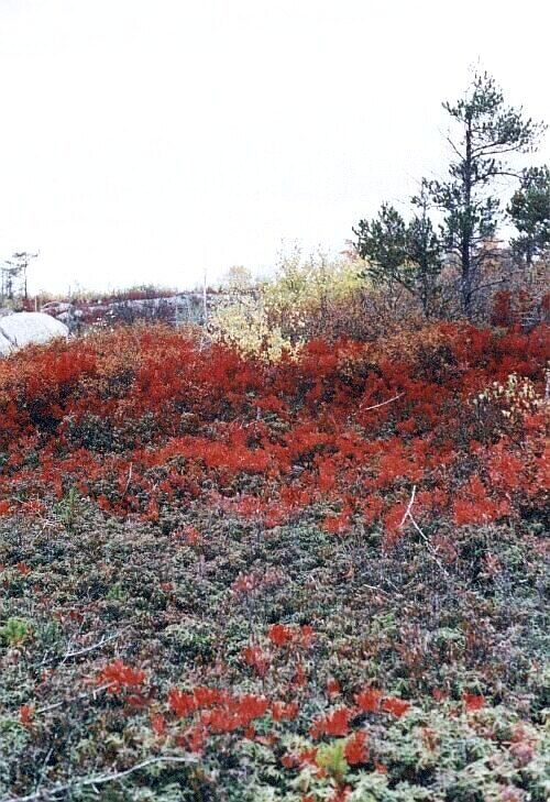 October 18 Spryfield - Granite Plateau - McIntosh Run - West Pine Island Pond | Starting in Spryfield, we cross the McIntosh Run and climb on to the granite plateau. The colours are spectacular, even though the sky is clouded. The patterns of colour vary. A boggy patch has different vegetation from the rest of the plateau. Sometimes the scarlet-leaved bushes predominate, but on other parts of the plateau the tone is set by birches, jack pines or other vegetation. Next we descend to the McIntosh Run and walk along its banks to West Pine Island Pond, where we see this beautiful fern, and admire the fall colours on the granite shore which is reflected in the water. We also encounter a beautiful combination of lichen, wintergreen leaves and blueberry plants growing on the shore of the lake. |