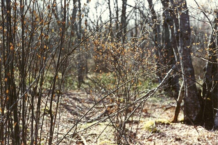 Spryfield - McIntosh Run | Starting in Spryfield, we are walking along the McIntosh Run at the very beginning of spring. Among the signs of spring are these maple blossoms and this sprouting tree, which we see as we look across the McIntosh Run. As we walk on a strip of granite flanked by juniper, we see sprouting larches. In the distance we see that the trees along the McIntosh Run are tinged with red, for they are maples. |