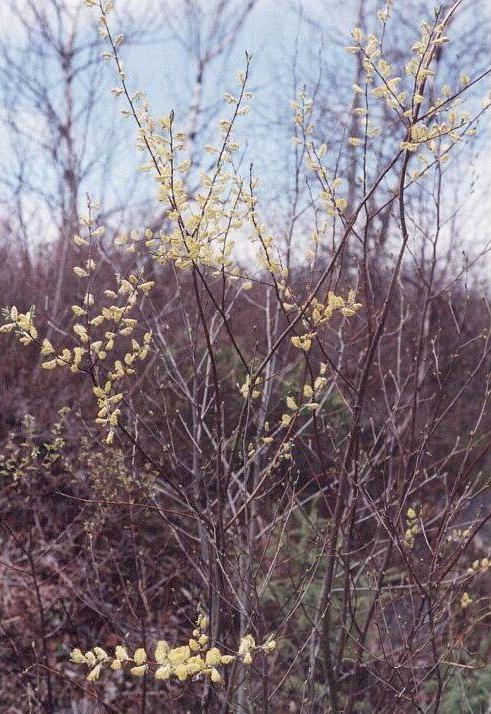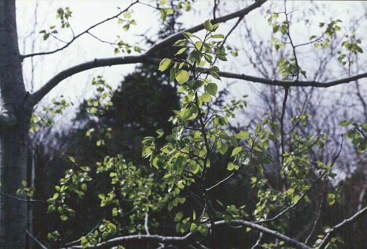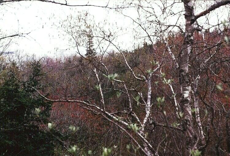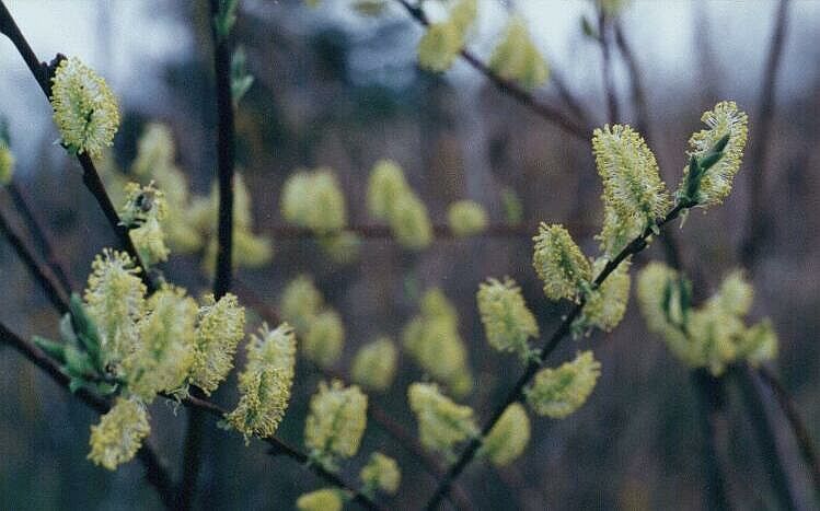 York Redoubt - East Pine Island Pond | Our point of departure is the church near York Redoubt. Walking along the old road next to the fort, we look across a stand of red tinged maples to the sea. A little further on we notice some lichens and polypody ferns and some white birch catkins. These young aspen leaves delight the eye as the sun shines through them. We now begin to walk downhill to East Pine Island Pond. Just before reaching it we see these yellow willow blossoms. At the lake we see that many different kinds of trees are sprouting and blossoming. |