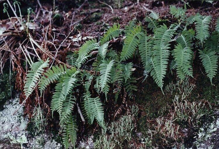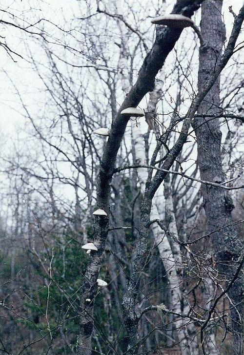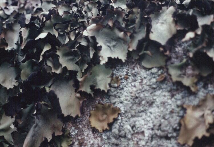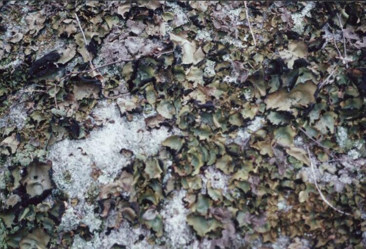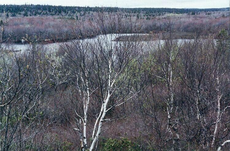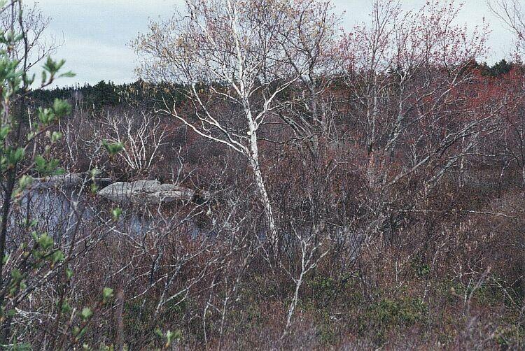 West Pine Island Pond - Granite Ridge between West Pine Island and Duck Pond | We now go up on to the ridge between East and West Pine Island Ponds, and have a view of West Pine Island Pond. The sprouting and blossoming trees paint the landscape in pastel shades which contrast with the bright colours of autumn. We go down to West Pine Island Pond. This green rock tripe, growing on a granite boulder by the lake, is very noticeable today, because of the weather. Even harder to overlook is a sequence of white tree fungi. We pass many more granite boulders on which rock tripe and lichen are growing. On this boulder there is some rock tripe resembling leaves. As we head up towards the granite ridge between West Pine Island Pond and Duck Pond, we stumble upon a lone white violet growing in the woods. Once we are on the crest of the ridge, we can enjoy the view over the birches and maples towards East Pine Island Pond. Later we have a view across the valley of the McIntosh Run. While we are on the ridge we also see this sprouting tamarack and British soldier lichen growing amidst rock tripe. |
