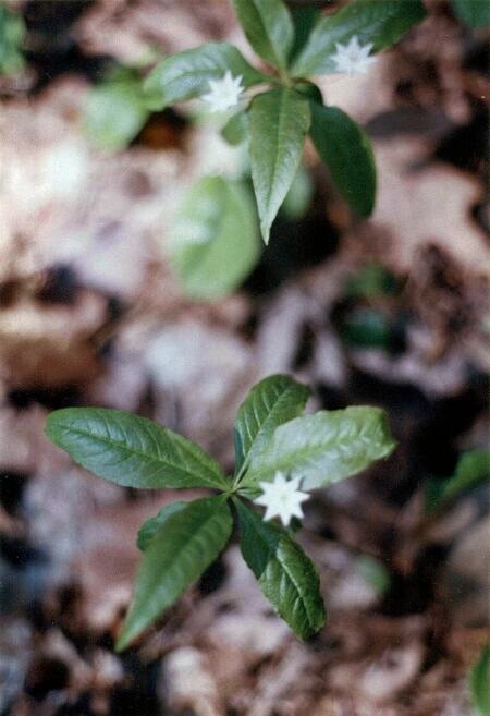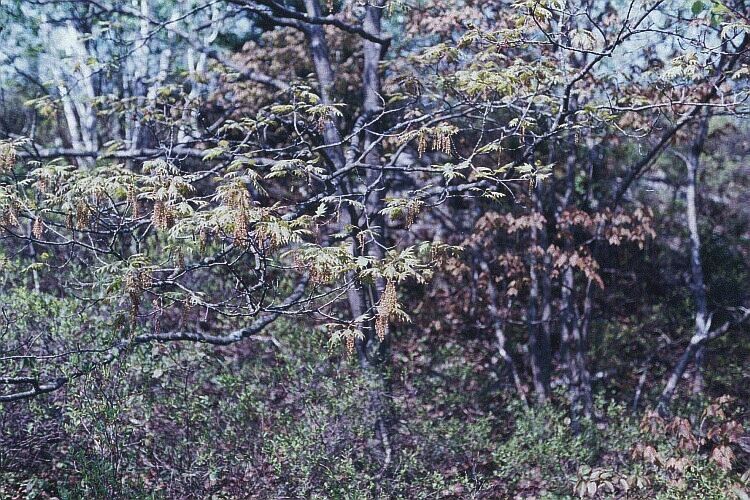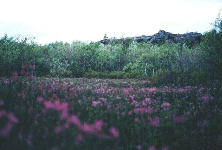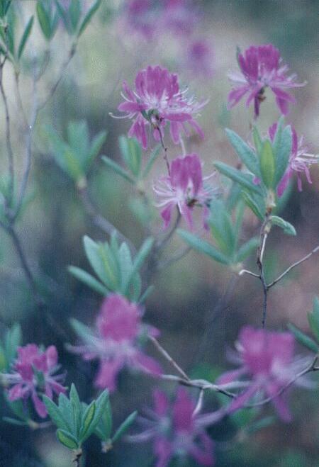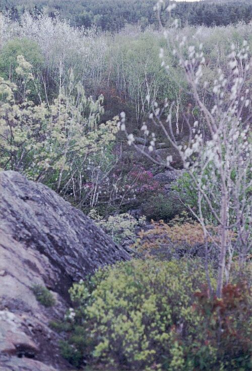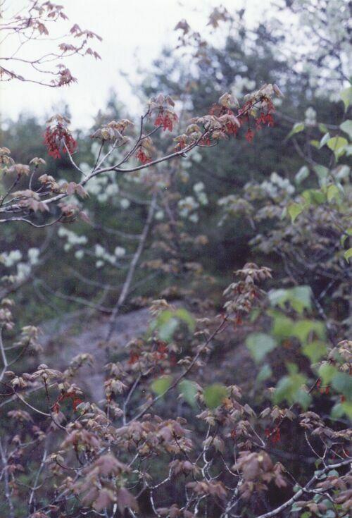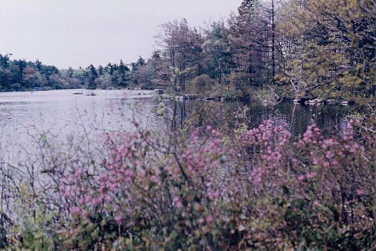 May 25 Dingle - Frog Pond - Jollimore - Williams Lake - Ridge south of Williams Lake - Colpitts Lake - Spryfield | Entering the Dingle to look at the spring vegetation, we go up on to a height of land and see a large-toothed aspen, with young leaves and catkins. On the ground there are flowering blueberry plants and wild lily-of-the-valley. On our way down from the height of land, we see an oak tree with catkins. On lower ground we find pink lady's slipper orchids and starflowers, as well as bunchberry flowers. At the Frog Pond we find a small amount of watercress blooming. A patch of rhodora is growing next to the Frog Pond, as are Clintonia flowers. In Jollimore we find some particularly fine rhodora blossoms. We are also delighted by a large patch of rhodora in a bog at Jollimore. Continuing past the eastern end of Williams Lake to the ridge on the south side, we encounter still more rhodora growing near the top of the ridge. Further along the ridge we have a beautiful view of a diversity of spring vegetation as we look towards the south. Also very beautiful are these red maple keys growing amidst other vegetation on the ridge. Leaving the ridge, we reach the west end of Williams Lake, and walk along the stream that flows in from Colpitts Lake. We pass this fresh green fern growing near the stream. We reach the north end of Colpitts Lake, and on our way to Spryfield we find these bluets on the path. |